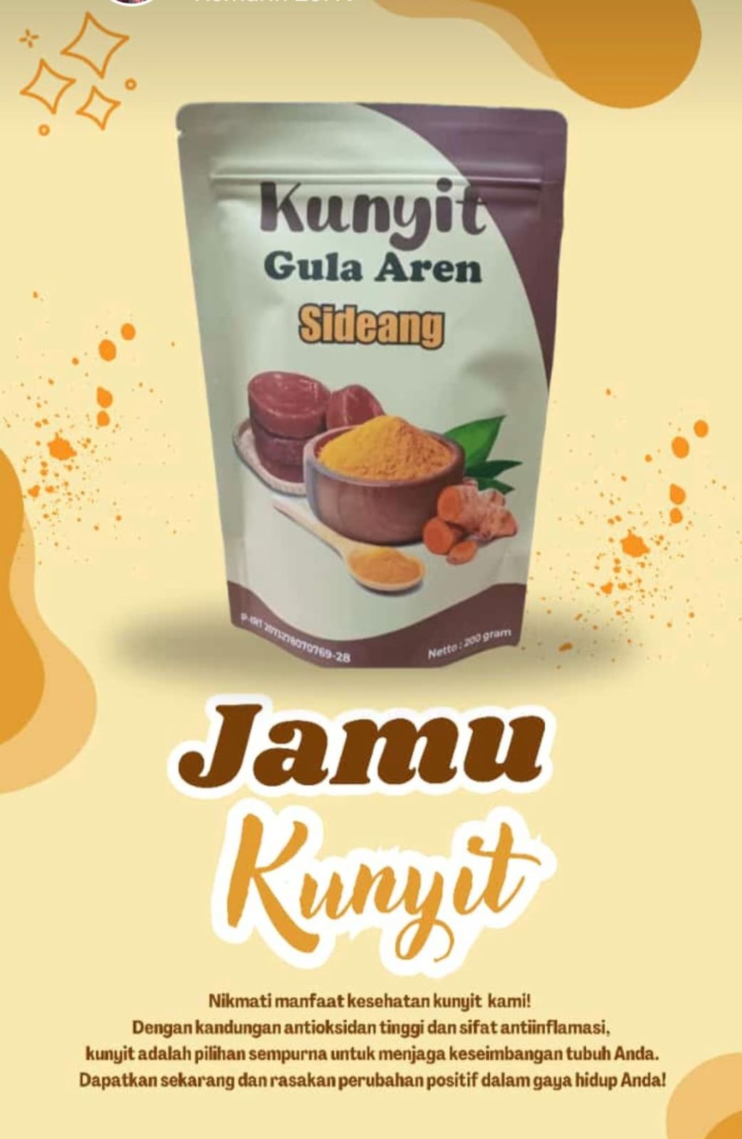 Nikmati hangatnya jamu kunyit alami dengan manis lembut gula aren. Terbuat dari kunyit pilihan yang kaya antioksidan, diproses higienis, dan tanpa bahan kimia tambahan. Praktis tinggal seduh!